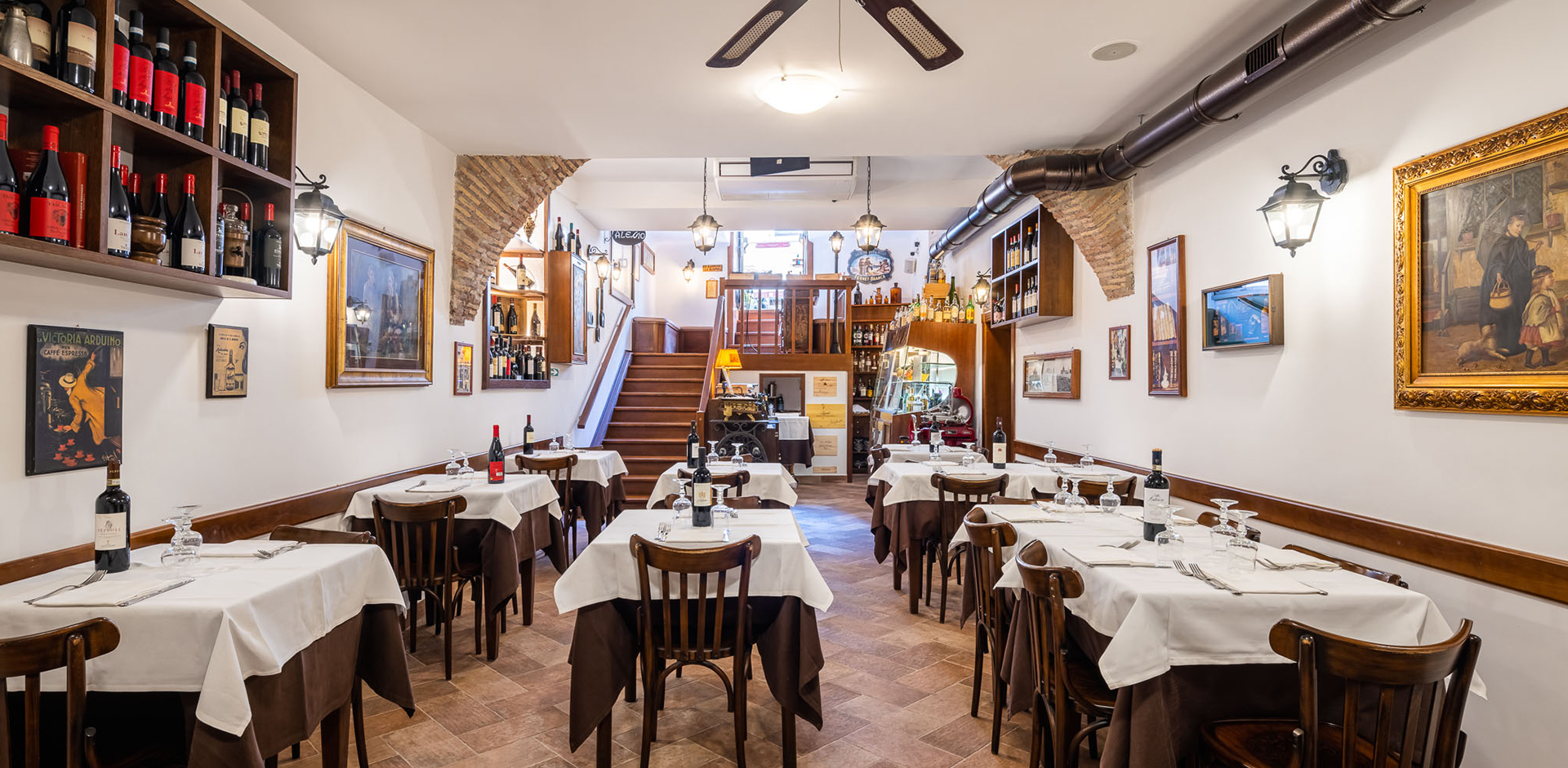 Lo testimoniano gli scalini in legno che dovrai percorrere per venirci a trovare, che insieme al legno, ai marmi e al ferro battuto che trovi all'interno, ricordano gli elementi tipici dei locali del centro storico dell’epoca. Inoltre, l’atmosfera e i sapori ricordano quelli di una tipica Hostaria romana.
